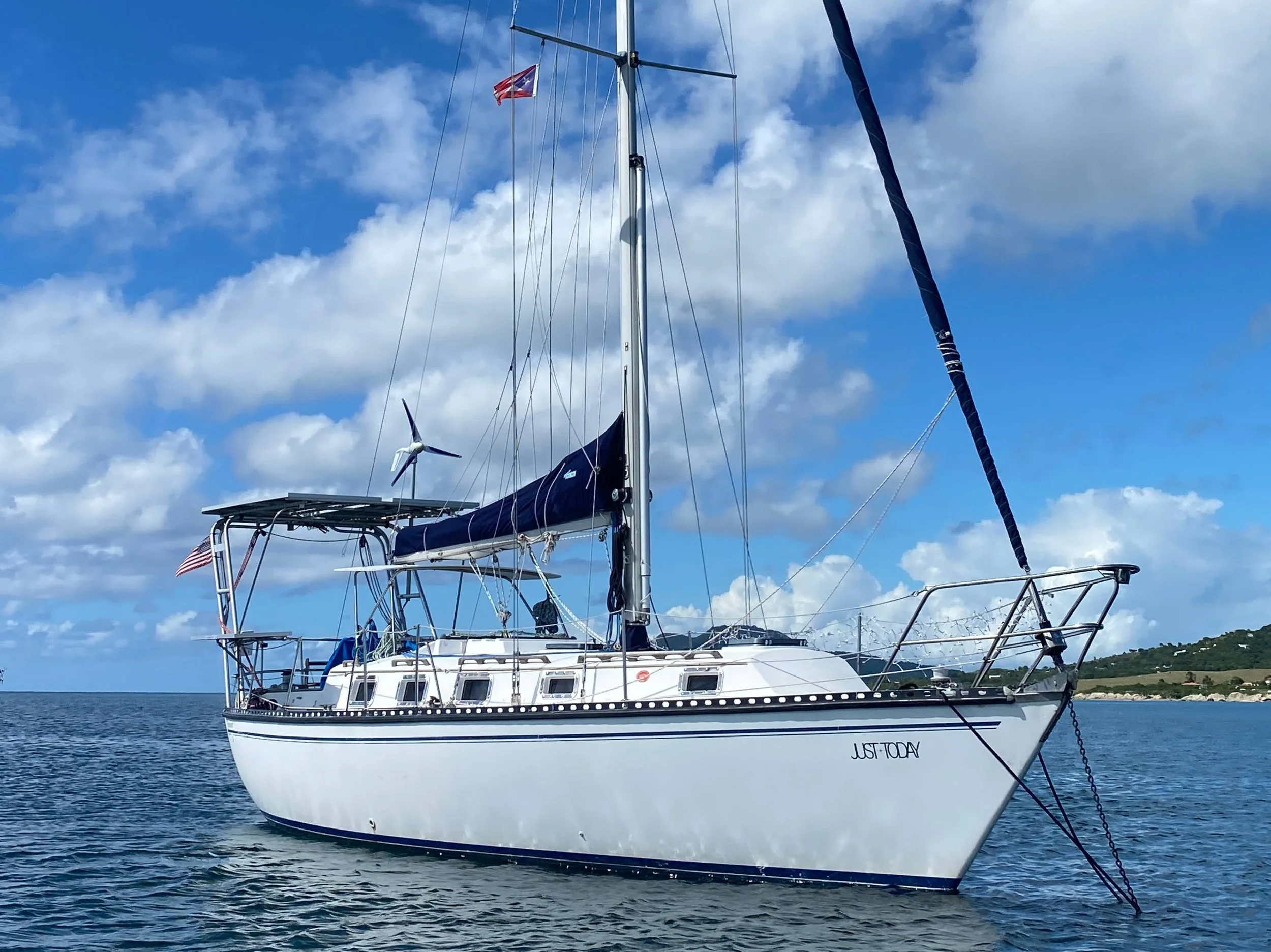 S/V Just Today is a Sloop-rigged Endeavor 33 built in 1984. An innovative and strong design for her generation, the 33 combines powerful sailing with smooth action through the water. The spacious interior is an inviting place to escape the elements and the cockpit offers excellent space to enjoy the Caribbean weather.